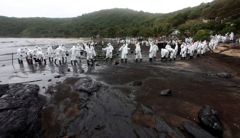 On Saturday, an oil pipeline leaked 13,200 gallons of crude oil (the equivalent of one and a half tanker trucks) into the Gulf of Thailand. The oil slick is continuing to spread, blackening the beaches and water of a tourist island in the country's eastern sea.