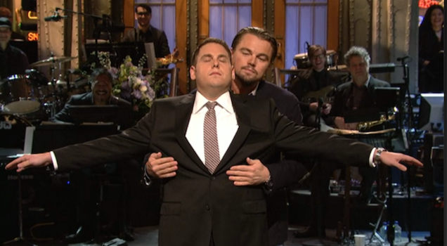 Last night on Drake TV SNL, Jonah Hill got a special visit from his pal and Wolf of Wall Street costar Leo DiCaprio. Though DiCaprio made no mention of Hill's salary for the money-grubbing film—potato peels and Dave & Buster's gift cards—the two did act out a scene from a very familiar movie, pan flute and all. Still no word on when exactly DiCaprio's jeans-with-belt-and-button-down look is going to end, but—really—he must be stopped.
