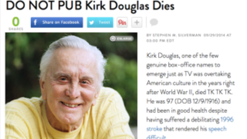 It's not clear when the obituary draft was actually posted on People's website (the magazine has a habit of backdating "DO NOT PUB" pieces), but it appears they've been ready for Douglas to kick the bucket since at least September.
