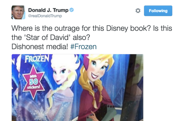 On stage at campaign rally in Cincinnati, Trump said that a tweet featuring a six-pointed star was only interpreted as anti-Semitic due to “racial profiling” by his critics. And on Twitter, Trump shared a photo of a Frozen sticker book featuring a similar shape, asking where the outrage was for the company founded by (alleged anti-Semite) Walt Disney.