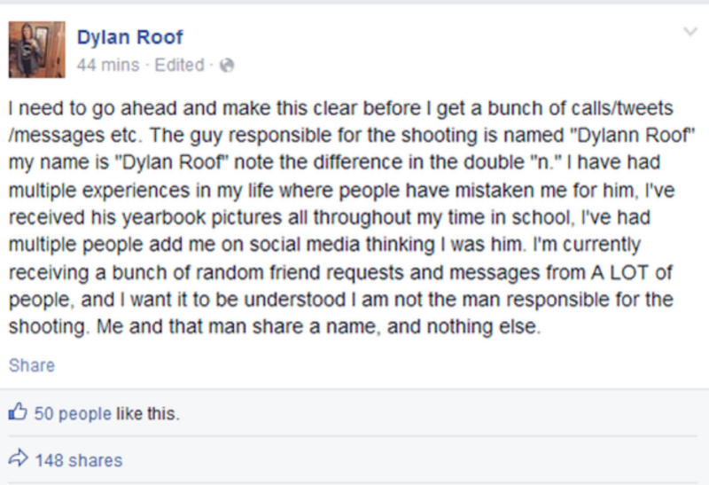 The identity of last night’s South Carolina church shooter was revealed this morning, igniting a frenzy to find any trace of information about him on the web. A quick misread might lead you to the Facebook page of Dylan Roof, a young West Columbia man who did not murder nine people last night.