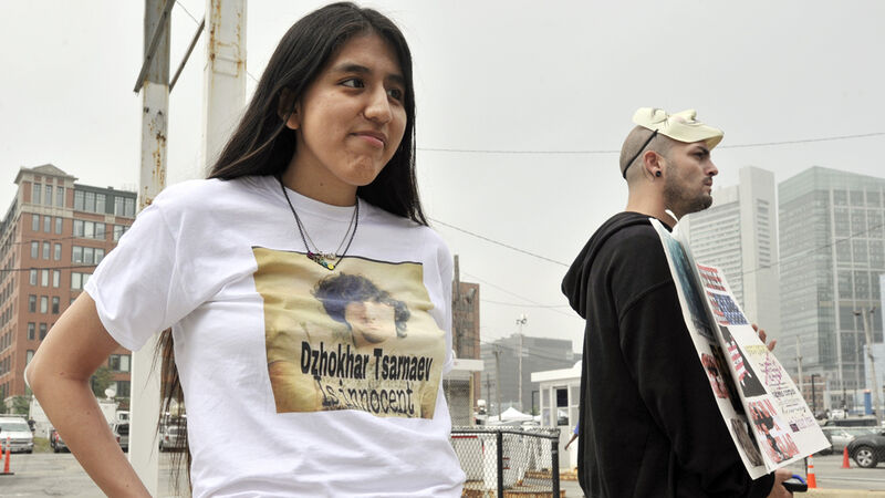 His crying family members weren't his only supporters. Outside the courtroom, a small group of Jahar defenders gathered, physical manifestations of the false-flag truthers and crushed-out fans who constitute the "Free Jahar" movement online. They'd come from Las Vegas and New York City; Jennifer Michio, above wearing the "Dzhokhar Tsarnaev Is Innocent" shirt, told the AP she was from Mashantucket, Connecticut.
