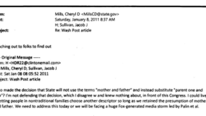 Said that she refused to “defend...in front of congress” the decision to drop “mother and father” in State Department usage in favor of gender-neutral terms (like on passports). Clinton reluctantly adds that she could “live with” another descriptor “so long as we retained the presumption of mother and father.” Anything else wouldn’t be worth “facing a huge Fox-generated media storm led by Palin et al.”