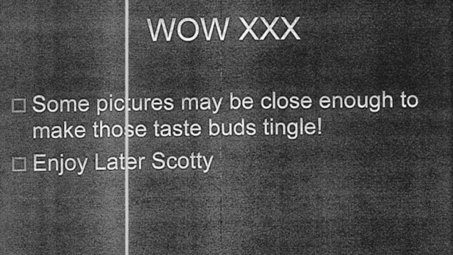 Another AG’s office official named Robert Soop forwarded a cache of faked nude Sarah Palin photos to his coworkers. The email originated with a man who does not appear to be a government employee, who included an expressively punctuated caption showing his appreciation of the craftsmanship that went into creating the images.