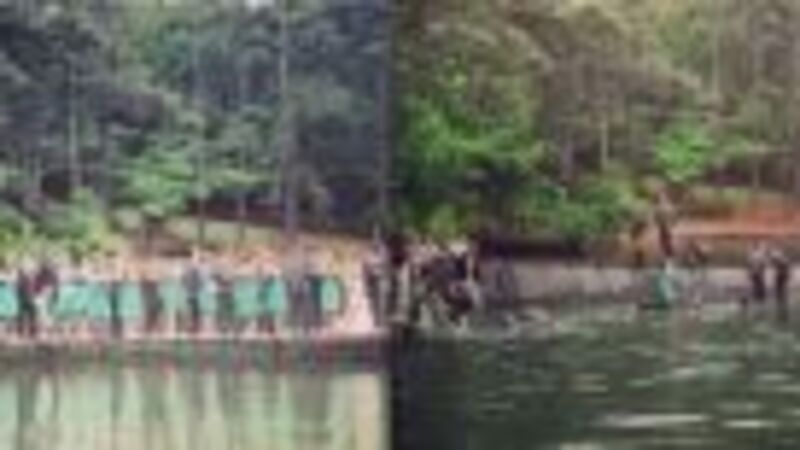 A bride and groom in Georgia thought they had avoided being soaked by an expected rainfall that never materialized, but wound up getting wet anyway when their entire bridal party — 29 bridesmaids and groomsmen in all — fell into Lake Lanier after the dock they were taking photos on collapsed.