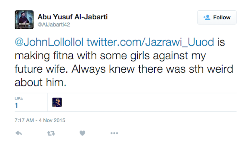 Abu Yusuf Al-Jabarti is an avid tweeter (his handle, @AlJabarti42, indicates he’s been banned 41 times) and supporter of the Islamic State. Most of his tweets are like this, just trying to expand his brand like everyone else: