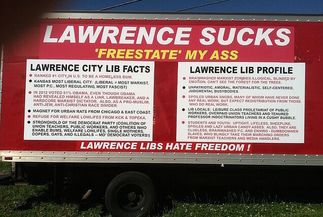 Now that the local Payless has closed its doors, dark days lie ahead for the residents of Lawrence, Kansas. But in case you weren’t quite sure how dark, the store’s failed owner has taken it upon himself to explain exactly what’s become of the “COMMIE & CANDY ASS CAPITOL OF KANSAS.” Through the art of truck poster.