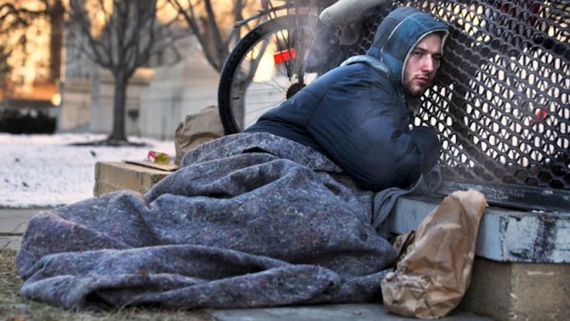 Nick warms himself on a steam grate with three other homeless men by the Federal Trade Commission, just blocks from the Capitol, during frigid temperatures in Washington, Saturday, Jan. 4, 2014.