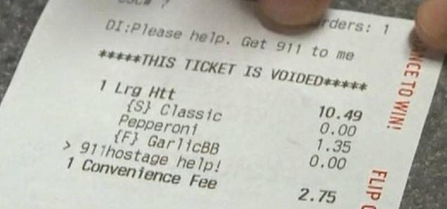 Employees at the Pizza Hut in Avon Park, Fla., recognized Cheryl Treadway’s name as a regular customer, and alerted police Monday when they received her order and message for help. “We’ve never seen that before,” Candy Hamilton, the restaurant’s manager, told WFLA. “I’ve been here 28 years and never, never seen nothing like that come through.”