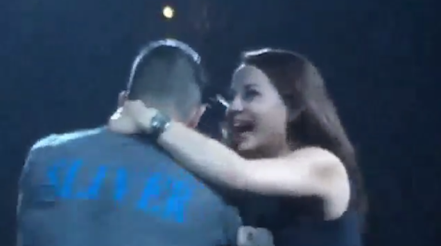 The wild-eyed fan somehow eluded security at Levine's Anaheim show, got onstage and managed to stay there, apparently until a security guy decided he felt like intervening.
