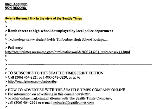 The EFF documents reveal that the FBI dummied up a story with an Associated Press byline about the Thurston County bomb threats with an email link "in the style of The Seattle Times," including details about subscriber and advertiser information.