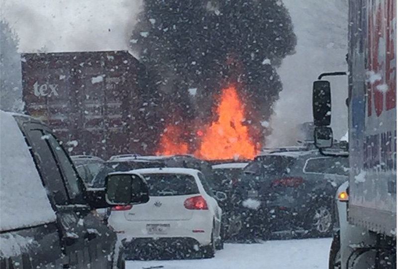 Dozens of cars—some reports put the number as high as 100—slammed into each other during a heavy snow squall in New Hampshire this morning, forcing authorities to shutdown a stretch of I-93 just north of Ashland. Photos of the fiery wreckage were posted by witnesses to Twitter and Instagram: