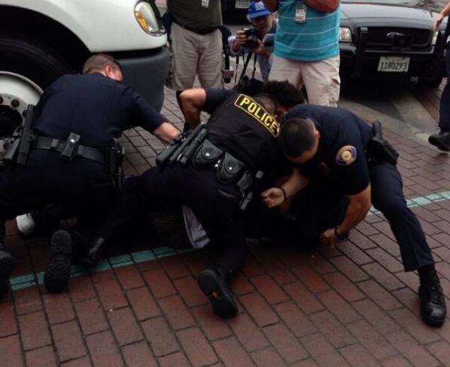 Fully aware of the fact that we now live in a time when people will beat one another up in the frenzy to obtain more consumer electronics, Apple had hired two Pasadena police officers to keep control of the crowd, many members of which had been waiting in line since yesterday. The officers quickly arrested the bickering men, both of whom, at ages 23 and 43, were old enough to know better.