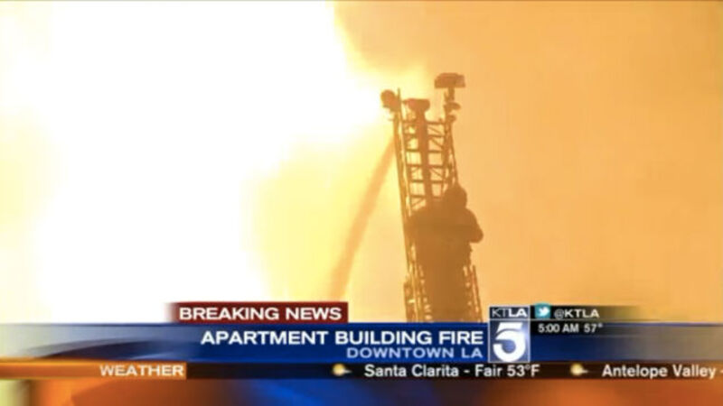 More than 200 firefighters were called to the scene of a seven-story apartment complex fire in downtown Los Angeles early this morning. The complex appears to have been leveled in the blaze, with two other buildings damaged and the 101 Freeway briefly closed off to traffic.