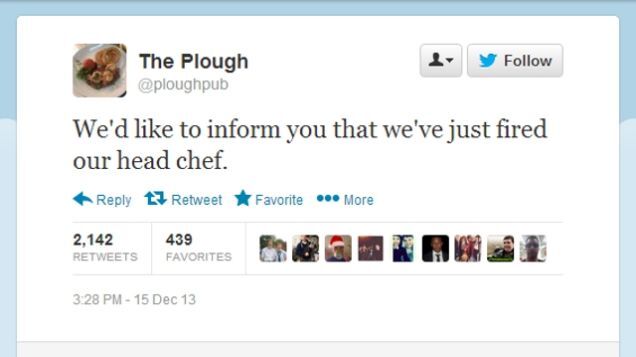 Unfortunately for them, the Plough Pub in Oxfordshire, England, failed to follow that basic rule of wrongful termination, leading sacked chef Jim Knight to seize its Twitter feed so he could tell his side of the story: