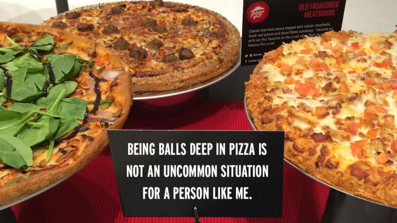 Earlier that day, Pizza Hut had announced that their previously foolproof business plan—make pizza, then sell that shit and fast—was getting re-conceived. In a company-wide rebrand that spans from their pizza box design to their nutrition to their ingredients to their ordering style, Pizza Hut revealed that the near 60-year-old franchise was going to be new(ish), like Oops!... I Did It Again era Britney Spears in some red latex and a hair poof. This newness included "ten new crust flavors, five new premium ingredients, four new flavor-packed drizzles, and new Skinny Slice pizzas," which at the event would result in eleven new pizza recipes for the taking, eating, and digesting with difficulty.
