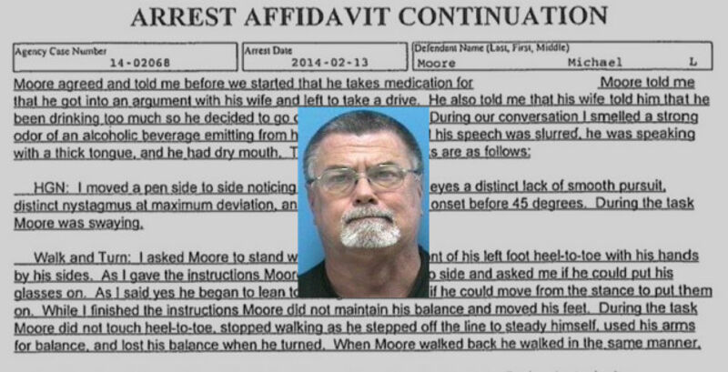 The glazzy-eyed, slurring Moore reportedly blew a .103 and .104 on a field test for blood-alcohol content, weeeeeellll over the state limit. He presumably managed to sleep it off before leaving custody on a $500 bond.