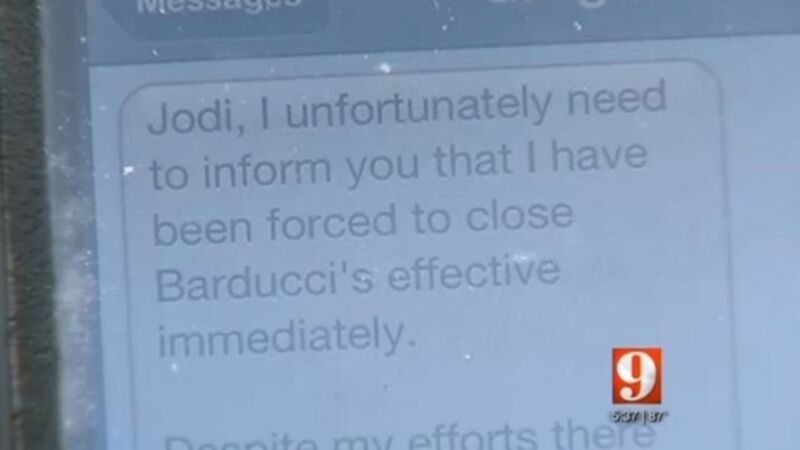 Gregory Kennedy, the owner of Barducci's Italian Bistro in Orlando, decided, for reasons that still aren't clear, to close down his restaurant earlier this month. But instead of holding an all-staff meeting, he sent the following text message to his employees on their day off: "I unfortunately need to inform you that I have been forced to close Barducci's effective immediately."
