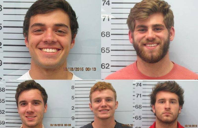 Per the Daily Mississippian, Tucker Steil was charged with felony assault; James Basile was charged with assault, hazing, and larceny; and Christian Guy, Kyle Hughes, and Austin Rice were charged with larceny. As you can see above, they smiled for their mugshots.