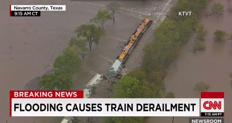 A freight train traveling through flooding in Northern Texas derailed on Saturday morning after its tracks were almost completely washed away. The train, which belongs to Union Pacific Railroad, was carrying 64 cars and two operators, both of whom swam to safety after the incident, according to the Associated Press.