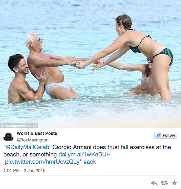 Naaaants een-vwen-yaaaaaaa ma-ba-gee-chi-ba-va (See-tee-hoummmm gwen-ya-maaaaa). And the old lion Giorgio Armani rose anew from the sea Thursday, January 1, 2015, surrounded by youthful companions.