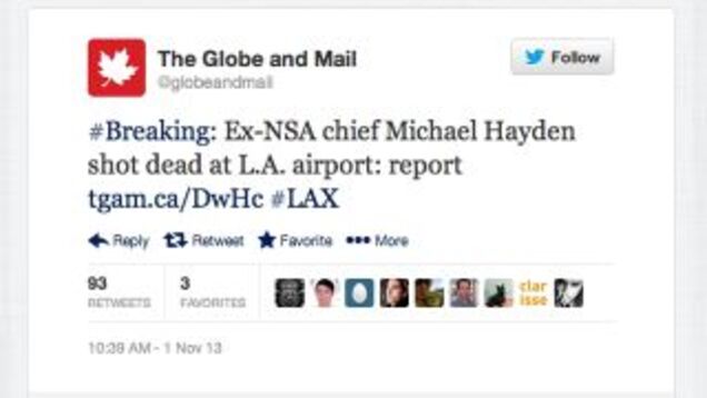 In its report on the shooting at LAX this morning, The Globe and Mail published a shocking report attributed to the LAPD that former NSA chief Michael Hayden had been shot dead in the incident, and that a "radical Christian group" had claimed responsibility.