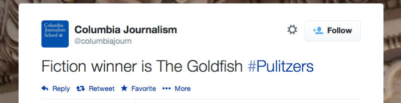Here is a very special citation from the Pulitzer committee. Tom Scocca4/14/14 3:17pmFiled to: literaturethe goldfinchthe goldfishjournalismismtypos142EditPromoteDismissUndismissHideShare to KinjaToggle Conversation toolsGo to permalink Here is a very special citation from the Pulitzer committee. Reply14 repliesLeave a reply