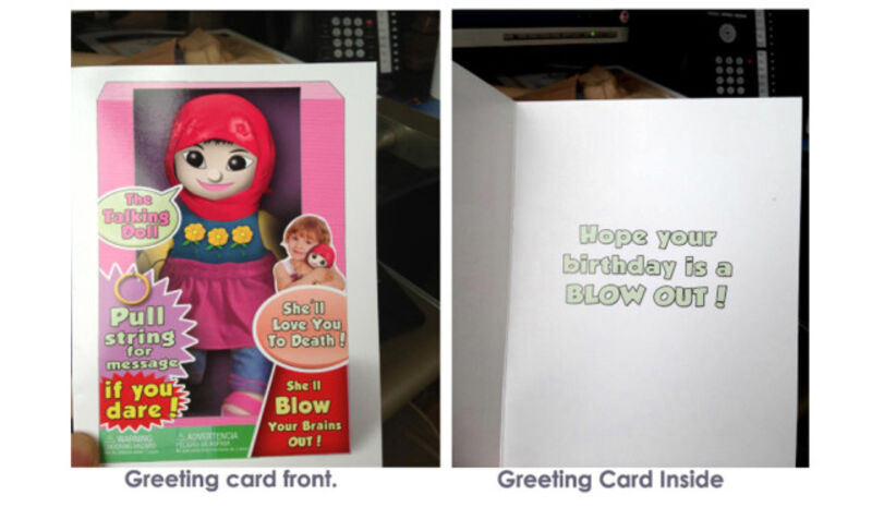 The baby-faced "Talking Doll" on the card, it's suggested, has some C4 for Allah strapped on underneath her modest flower-print dress. "Pull string for message if you dare!" the card shouts. "She'll love you to death! She'll BLOW your brains out!" (The gag, apparently, is that you, dear reader, should be so lucky to have a "BLOW OUT!" birthday, ha ha ho ho.)