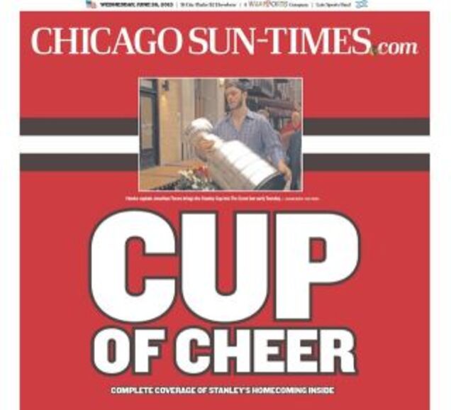 Above, the Chicago Sun-Times' front page the day after its local hockey team took home the Stanley Cup. Below, the Chicago Tribune's front page that very same day.