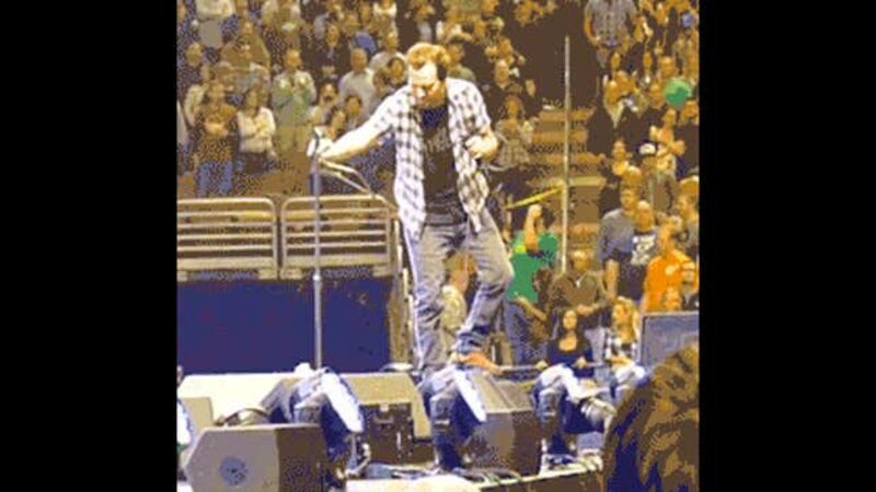 Eddie Vedder, the lead singer of a garbage band called Pearl Jam, fell down on Tuesday night while performing in a garbage city called Philadelphia, on the band's 23rd anniversary of making garbage music. He's OK. [Via @chunklet]