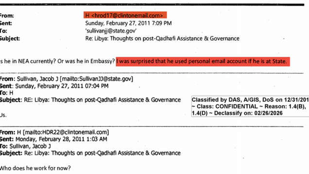 In this email—which we’re able to read only because a judge said she had to show it—Clinton says she’s “surprised” that a State Department employee used a personal email account to send his overview of Libyan politics. The joke is that Clinton was doing the exact same thing. The “I was surprised” email itself comes from Clinton’s personal email account.
