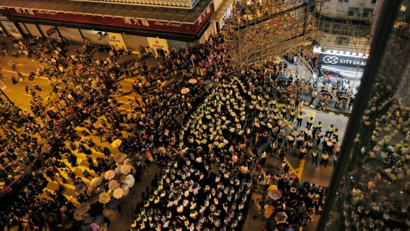 According to Hong Kong authorites, via CNN, 9,000 protesters flooded the Mong Kok district early Saturday to reclaim it after police pushed them out the previous day. At least 33 arrests were made. Hong Kong’s Hospital Authority reported at least 240 injuries.