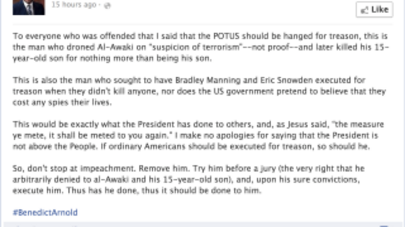 As word of his sentiments got out, Black amplified this point to his followers on Facebook: Barack Obama is a traitor, and we hang traitors, don't we?