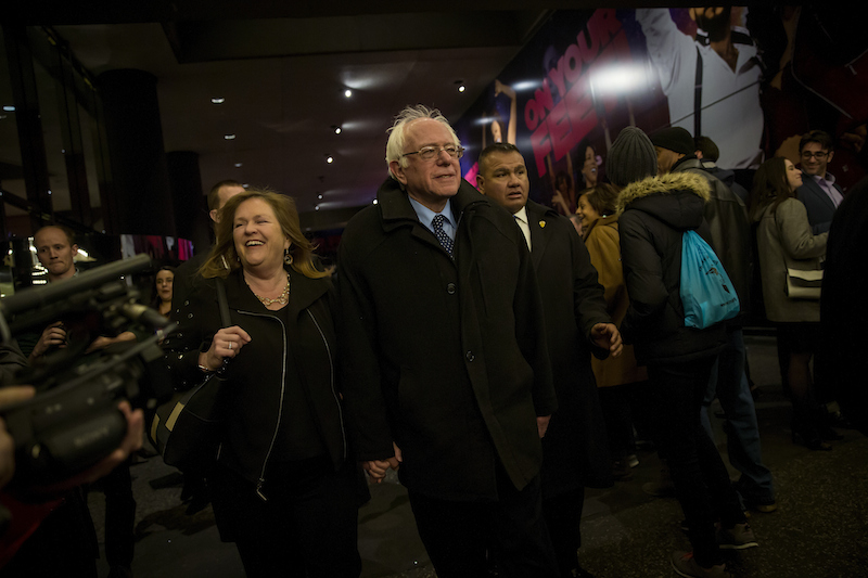 The man of the people, the champion of the underserved, the enemy of all things “establishment” was seen strolling across the plush carpet of the Richard Rodgers Theater off Times Square, attending a performance of the wildly popular play “Hamilton” with his wife Jane on Friday night.