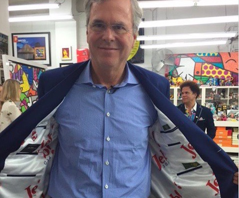 But Jeb! Bush, always the go-getter, went a step above and beyond: he, presumably, hired a tailor specifically to sew fabric emblazoned with his logo onto the inside of a sport coat. An attendee at Art Basel in Miami this weekend got a great snap of the Republican presidential candidate showin’ off the goods:
