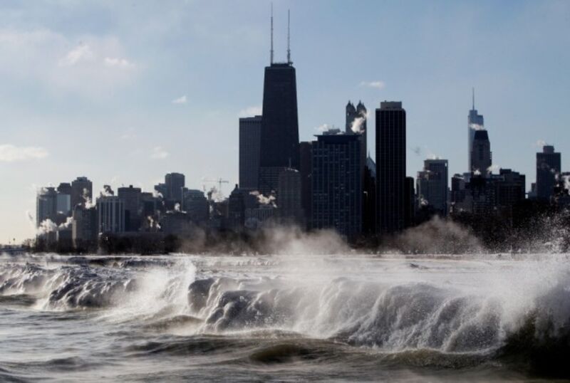 [Ice forms as waves crash along the Lake Michigan shore on Monday in Chicago. Below-zero highs have returned to many parts of the Midwest, bringing wind chills ranging from the negative teens to 40s, school cancellations and sighs of resignation from residents who are weary of bundling up. Image via Kiichiro Sato/AP.]