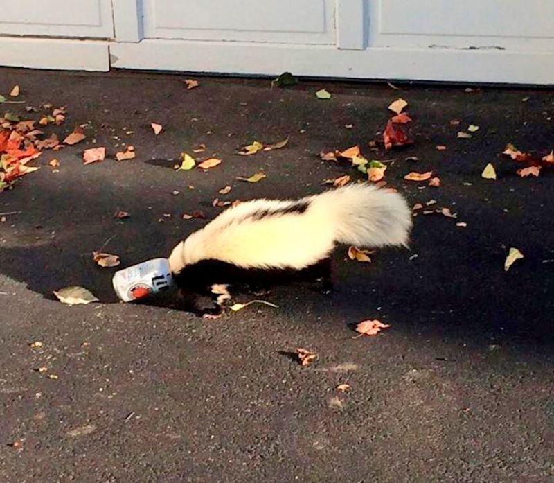 A little skunk buddy who was living peacefully in the wilderness of Oxford, Ohio took to drinking this week instead of dealing with his problems head-on. As a result, the little stinker got his head stuck in a can. Uh oh, time to get blottoed.