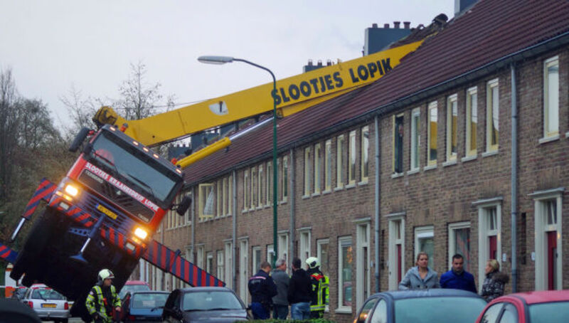 Then the crane fell again during attempts to right it with a larger crane, bashing in the rest of the neighbors' roof. The town's mayor is on the spot after the building was declared unsafe. Six apartments were evacuated.