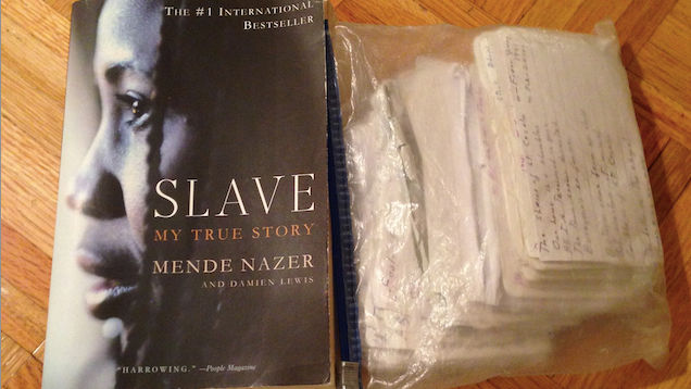 And so, after Sousa’s “Washington Post” and the fireworks, as we were cleaning up our multifamily encampment just outside the VIP section barriers, we found abandoned on the grass this copy of Slave: My True Story by Mende Nazer, accompanied by a well-worn Hefty zipper bag full of note cards.