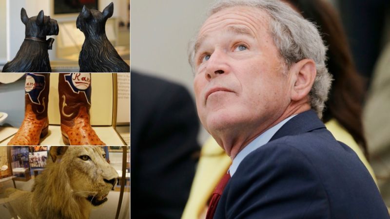 That being said, Laura Bush's ball gowns as well as the First Scotties are featured in their own full-on displays among the 43,000 artifacts and 200 million emails at the library. There is a recreation of Bush's oval office, what appear to be ostrich cowboy boots with a Texas state outline and Rangers on them, and other swag gifts to the Bushes—including jewelry, dog bowls, and a taxidermied lion from the Tanzanian President Jakaya Kikwete given on Bush's trip to Africa in 2008.