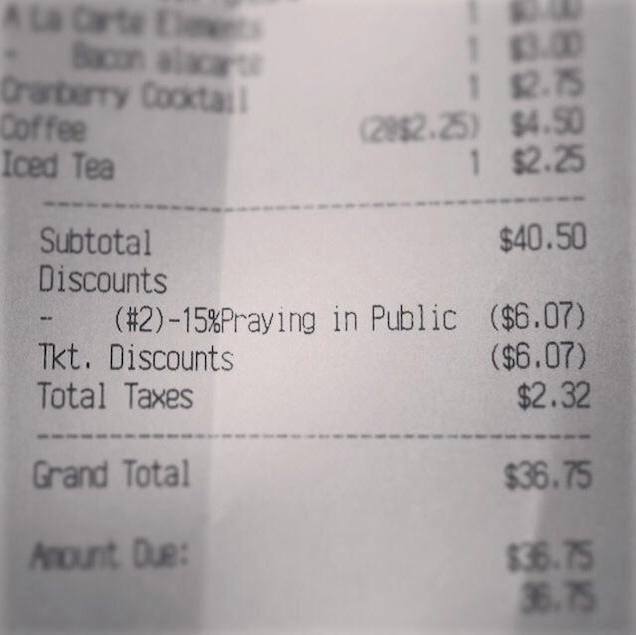 Word spread about the discount when Jordan Smith, a customer on a business trip, stopped by for breakfast on July 30 and posted her "praying in public" discounted receipt to Facebook. The Florida-based Christian radio station Z88.3 posted that same receipt to its Facebook page, and now this praying-in-public thing seems to really be catching on.