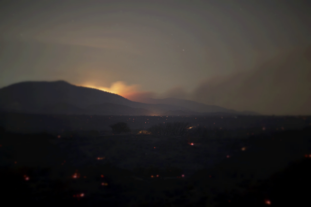 In the foreground, a landscape of embers, left this morning by the “North Fire,” which prompted people to abandon their cars on the 15 freeway near Victorville, California, smolders. Two people were injured. In the distance, a new fire, dubbed the Pine Fire, takes hold. Funny how that happens!