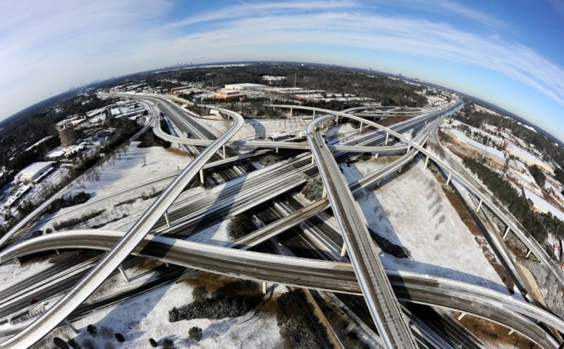 [In this photo taken with a fisheye lens over the perimeter highway known as "Spaghetti Junction" in Atlanta on Wednesday, the ice-covered system shows the remnants of a winter storm that slammed the city with over 2 inches of snow, turning highways into parking lots when motorists abandoned their vehicles. Image via David Tulis/AP.]
