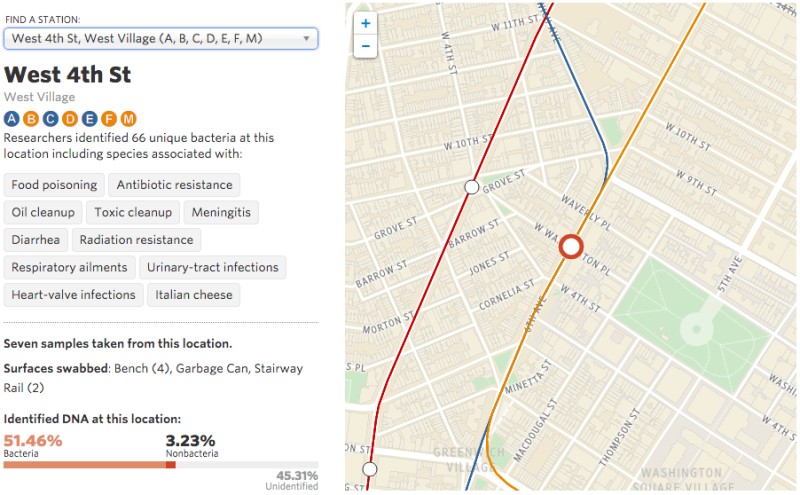 The widget visualizes data collected by researchers at Weill Cornell Medical College, which swabbed garbage cans, benches, handrails and turnstiles across the five boroughs. The result is that, if you live in New York, you can find out which viruses you slide your hands across multiple times a day.
