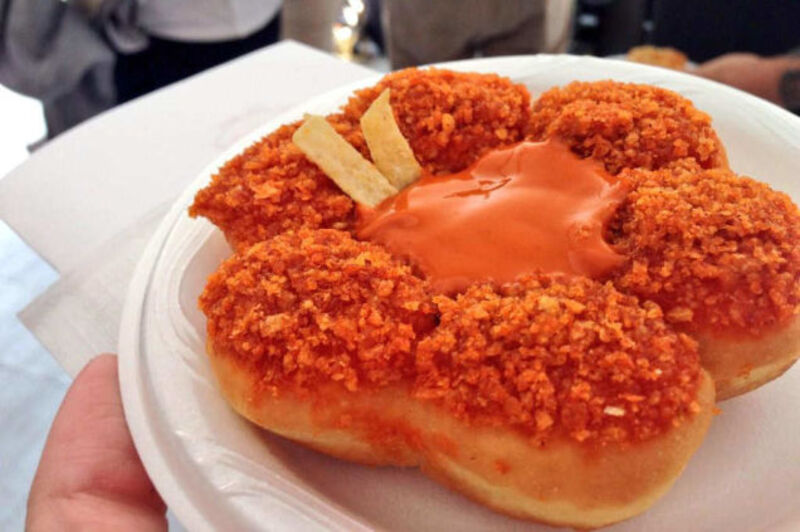 It consists of a pull-apart yeast doughnut that's dunked in Buffalo sauce and crusted with crushed-up chips. It combines a staggeringly high number of junk-food influences (Buffalo sauce, tortilla chips, doughnuts) while still managing to make sense. The corn-chip strips in the center are decorative, and the doughnut comes in mild and hot varieties — mild is "toned down" with Ranch dressing. It costs $2.