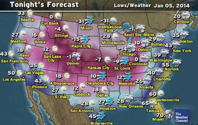 Above you see the low temperature forecasts across the country for Sunday night. If you live in the Midwest you might want to turn on your oven and then lay across your stove.