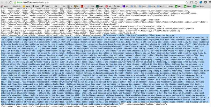 For an hour or so this afternoon, buried in the source code of Jeb Bush’s website were several paragraphs summarizing the plot of the “Die Hard” movie franchise.