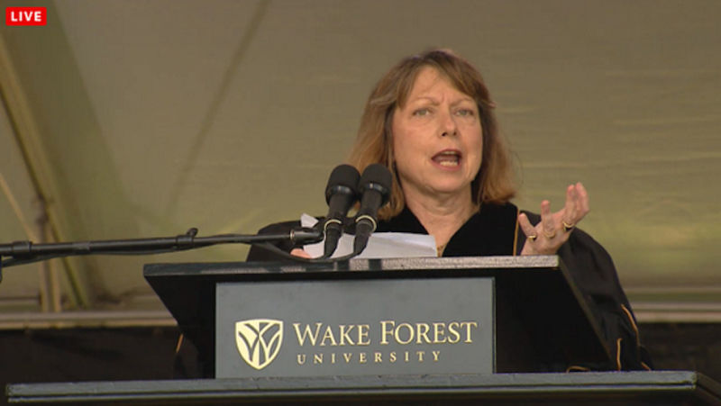 During her commencement speech at Wake Forest's graduation ceremony this morning, Jill Abramson addressed her recent firing as Executive Editor of the New York Times, comparing her current position to that of many of the graduating students.