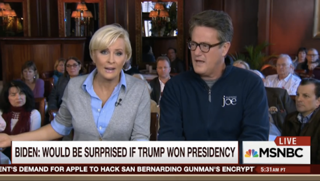 The segment is ostensibly about Joe Biden when it begins, but the other Joe takes it off the rails almost immediately. You have to feel bad for Michael Steele and the guests who flanked the hosts this morning, who I can only imagine spent much of the 10 minutes staring at their laps, waiting for it to be over.