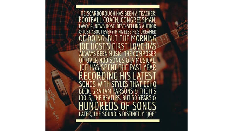 Joe Scarborough has been a teacher, football coach, congressman, lawyer, news host, best-selling author and just about everything else he’s dreamed of doing. But the Morning Joe host’s first love has always been music. The composer of over 400 songs and a musical, Joe has spent the past year recording his latest songs with styles that echo Beck, Graham Parsons & The His Idols, The Beatles. But 30 years and hundreds of songs later, the sound is distinctly “Joe.”